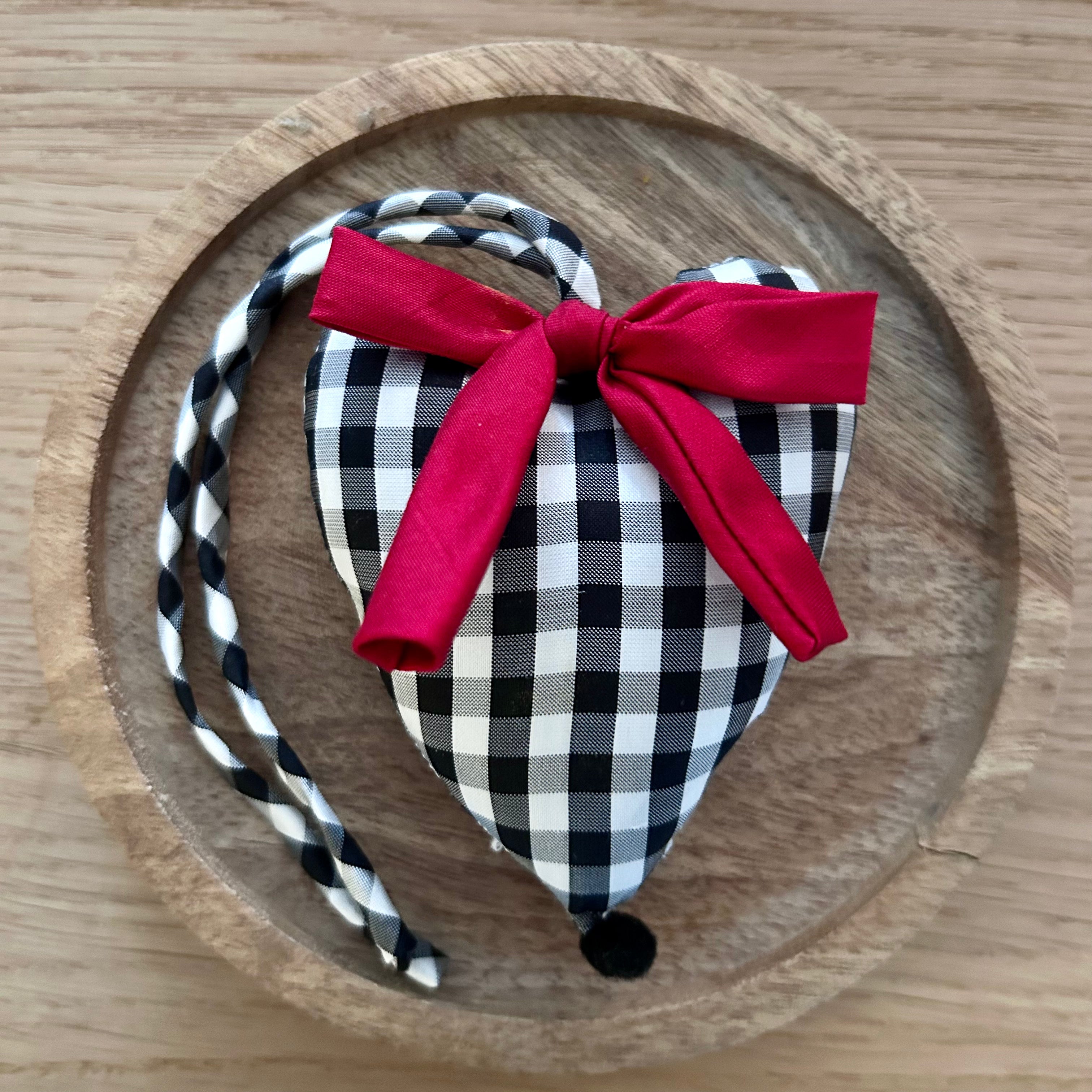 Seide schwarz/weiss kariert, Karogrösse 5 mm, mit roter Seidenmasche, kleinem Pompom und Aufhängeband, Masse ca. 8 x 10 cm
