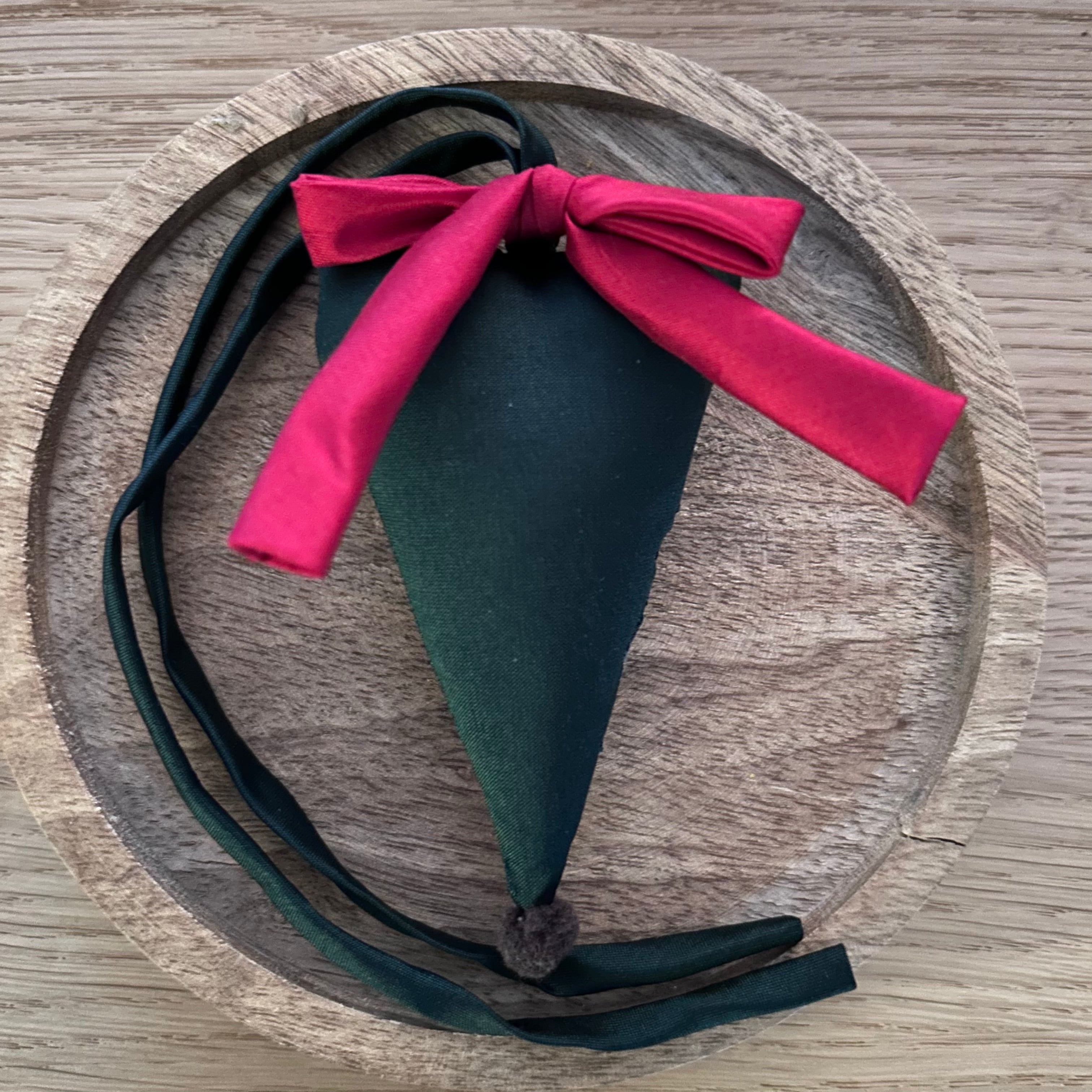 Seide dunkelgrün uni, mit roter Seidenmasche, kleinem Pompom und Aufhängeband, Masse ca. 6 x 10 cm